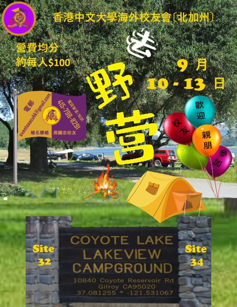 本年度的野營已於9月8日至11日在 Clear Lake State Park 第 59 及 60 號營地舉行。這兩個營地靠近湖邊及一個近乎私有的沙灘,環境非常恬靜舒適,各營友皆盡情在此進行各種陸上和水上活動, 享受一個舒適的假日。這四日三夜的野營生活更讓平日深藏不露的大廚們大演身手,而令營友們大快朵頤, 讚口不絕. Clear Lake 是加州最大湖泊, 湖水清澈, 風景秀麗, 各營友亦不惜大解慳囊, 租機動快艇沿湖飛馳, 盡享湖光山色和難得的駕船樂趣。四日三夜轉眼便過去,各人皆樂而忘返,期待下一個野營的來臨。(可按上面標題或右面圖片觀賞是項活動的相片)
